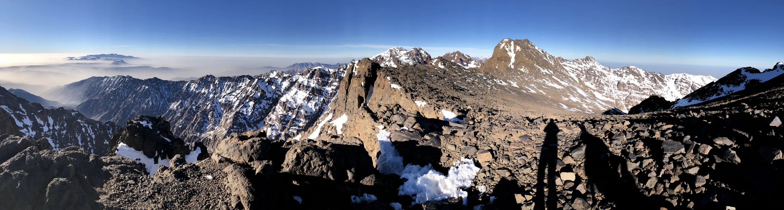 We couldn't see the sunrise from inside the bowl of high peaks, but we watched the sky transform from ink to pale blue and paused to take it in. The next long stretch of the hike covered an open, icy snowfield that kept climbing up, till we reached the edge of the snow just below a ridgeline. We stopped here to take off our crampons and the sudden loss of awesome cleat-powered traction had me stumbling and sliding in the rock skree and loose dirt. The ridge formed a shoulder that led to the final ascent up to the summit, but from here we could already enjoy a commanding view of the Atlas Mountains -- infinite peaks that pierced the low clouds and left us breathless, literally and figuratively.